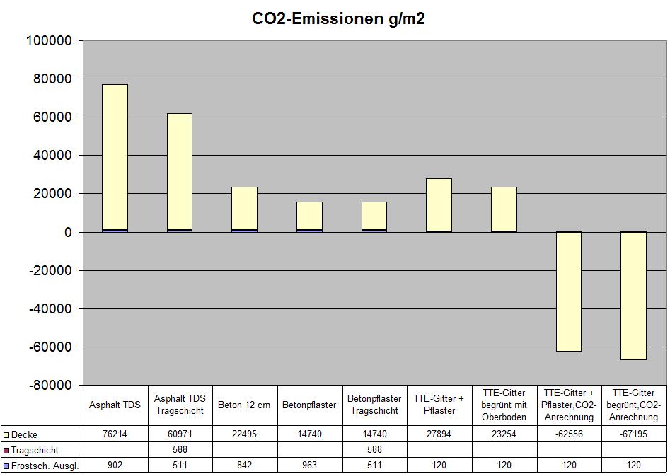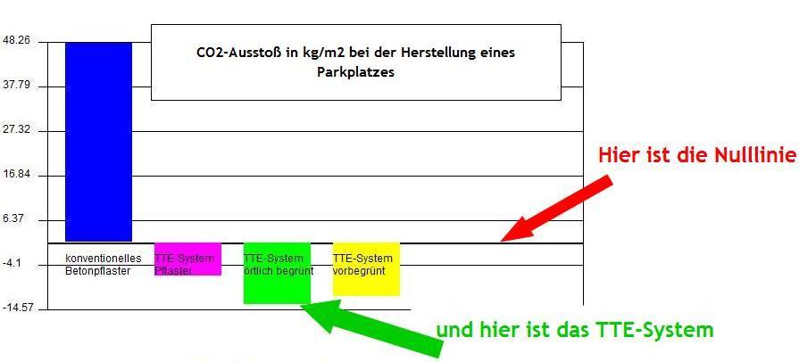 | Bauweise | konventionelles Betonpflaster | TTE-System Pflaster | TTE-System örtlich begrünt | TTE-System vorbegrünt | |